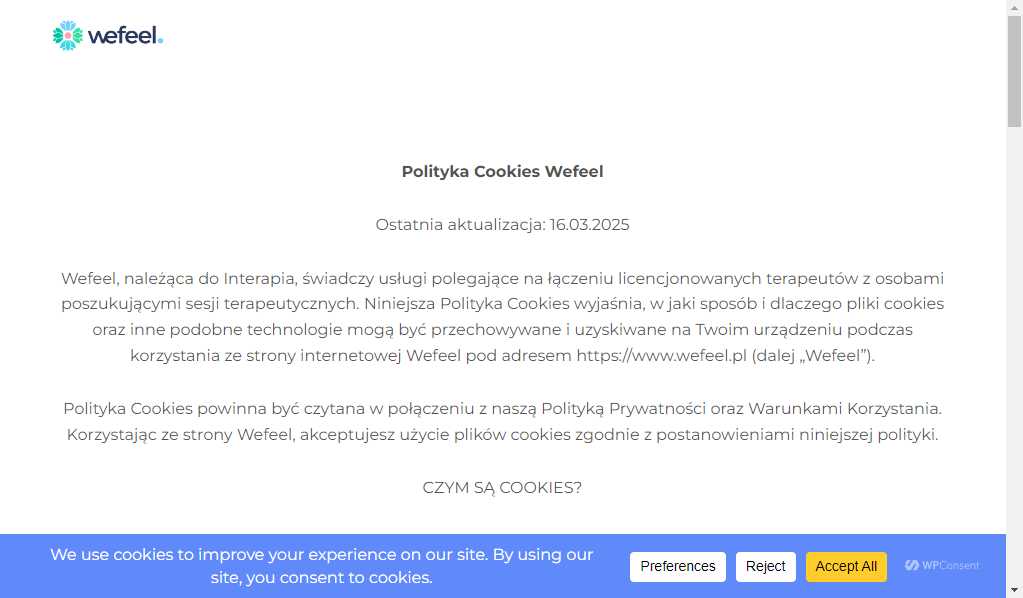 Na stronie dostępne są profile terapeutów, opisy ich podejść oraz kalendarze spotkań, co pozwala wybrać osobę, z którą rozmowa będzie najbardziej swobodna. WeFeel tworzy środowisko sprzyjające rozwojowi i pracy nad samopoczuciem w tempie odpowiadającym klientowi.